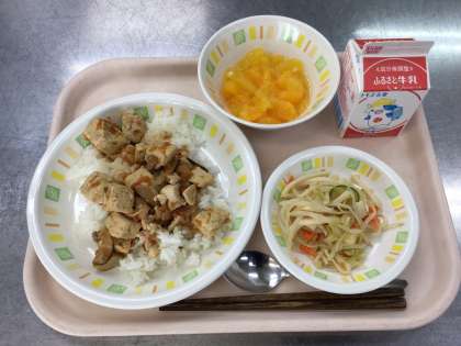 今日の給食は、四川豆腐丼 牛乳 中華サラダ みかんクラッシュゼリー