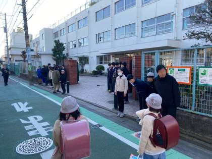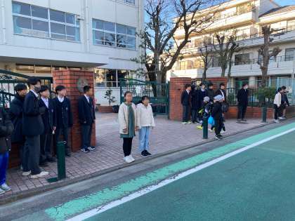 尾山台中学校の生徒と協力し、挨拶運動を行いました。
