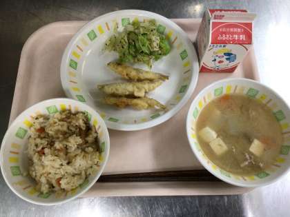 今日の給食は、とりめし 牛乳 天ぷら(わかさぎ) 野菜のゆかりかけ 豚汁