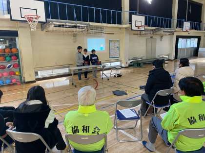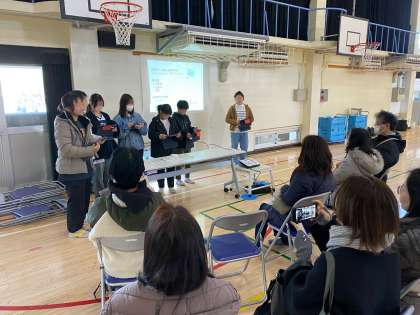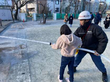 防災について学んできたことをまとめ、地域や保護者の方々にむけて発表を行いました。等々力町づくりセンター主催で、地域の方々やおやじの会、消防団の皆さんにも協力していただき、消防活動や起震車を体験しました。
