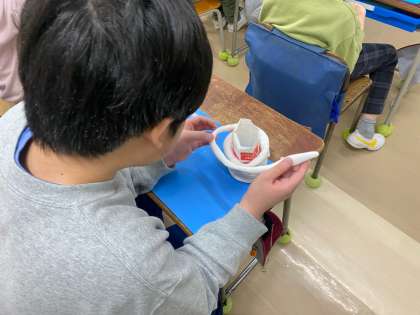 紙粘土でペン立てを作っています。紙粘土を細くしたり、ボンドを適量付けてくっつけたりと、繊細な作業です。