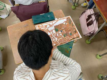 版画刷りをするための台紙を作っています。カッターを使って慎重に切り出しています。
