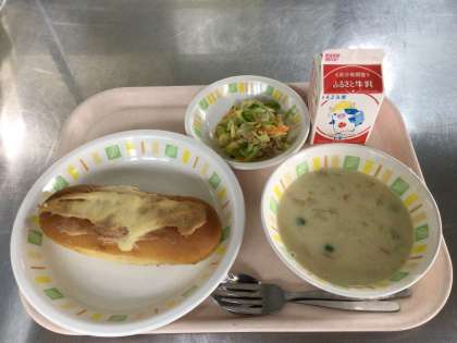 今日の給食は、ビスキュイパン 牛乳 コーンシチュー キャベツとツナのサラダ
