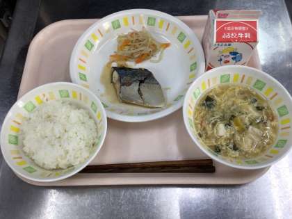 今日の給食は、ごはん 牛乳 さばのみそ煮 もやしの甘酢かけ かきたま汁