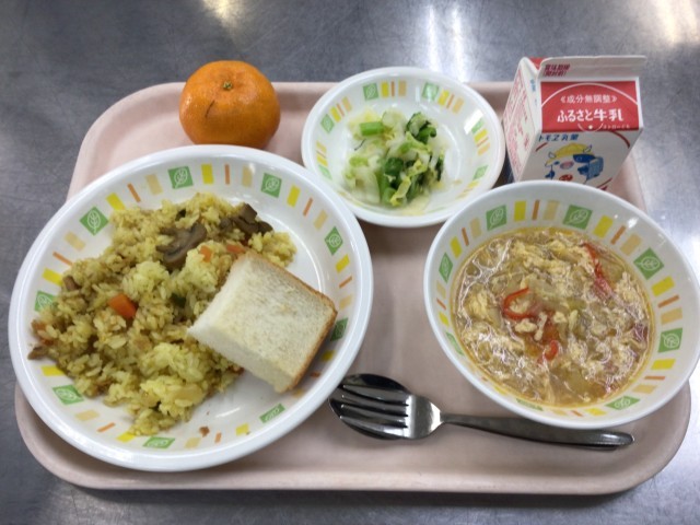今日の給食は、ツナピラフ 牛乳 アクアコッタ 白菜のサラダ ぽんかん