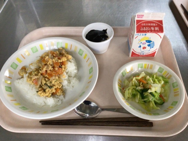 今日の給食は、親子丼 牛乳 野菜のひとしお 白玉だんご(黒ごまだれ)