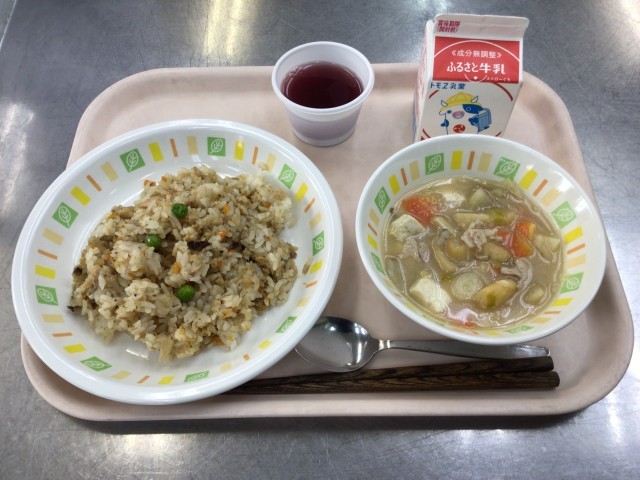 今日の給食は、ツナそぼろ丼 牛乳 豚汁 ぶどうゼリー