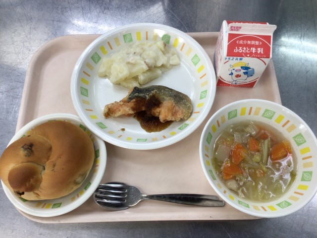 今日の給食は、ぶどうパン 牛乳 魚のバーベキューソース じゃがいものクリーム煮 野菜スープ