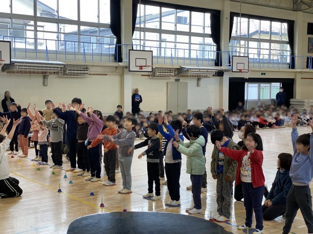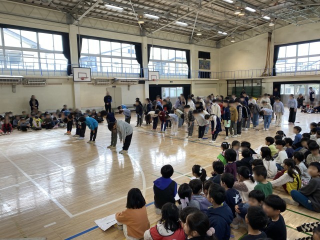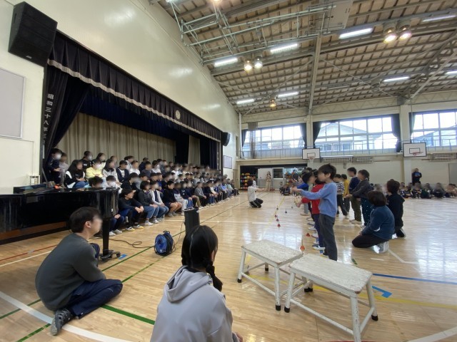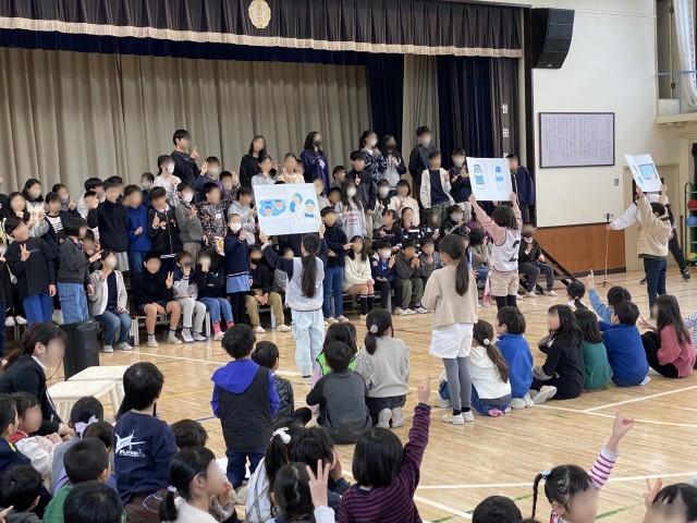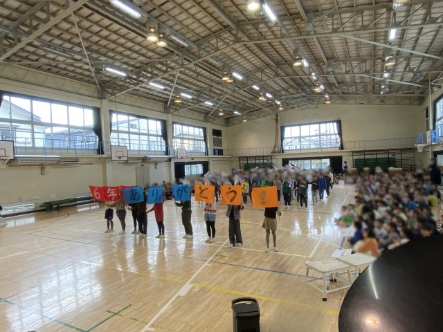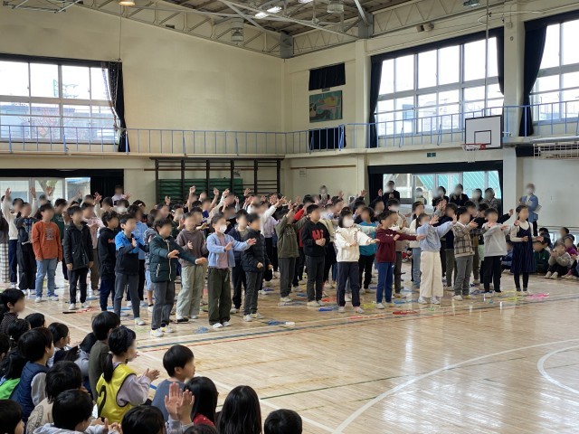 全校で交流する最後の行事である6年生を送る会がありました。3年生のクイズとダンス、4年生のエール、けやき学級の手話を交えた歌の出し物の様子です。