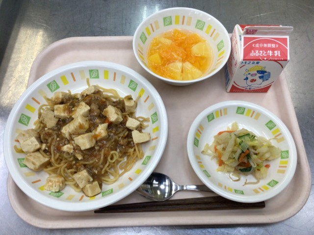今日の給食は、麻婆豆腐焼きそば 牛乳 中華サラダ フルーツポンチ