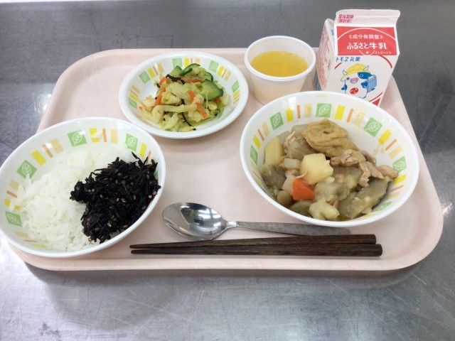 今日の給食は、ごはん ひじきとおかかのふりかけ 牛乳 筑前煮 野菜の塩こんぶかけ フルーツゼリー