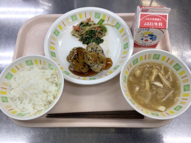 今日の給食は、ごはん 牛乳 おから入りさくさくつくね 野菜のごまあえ みそ汁