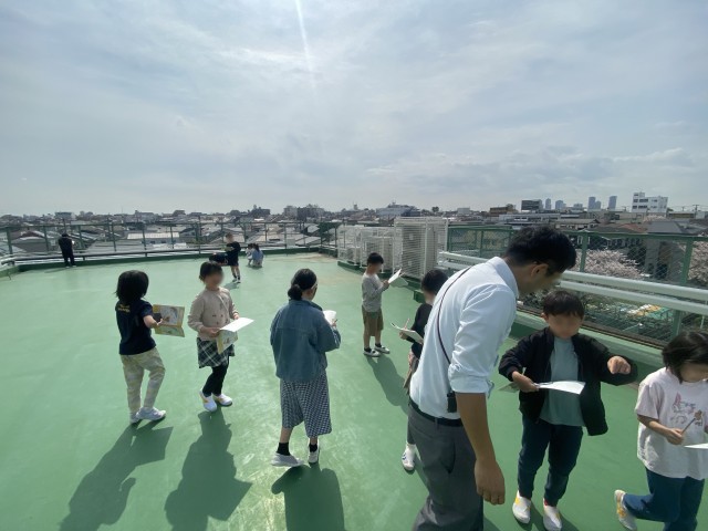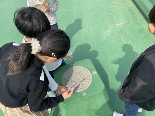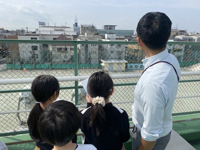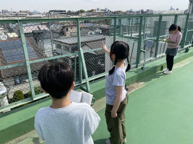 こちらのクラスでは初めての社会の授業がありました。方位を学習した後、屋上からどの方位にどんなものがあるのかを観察しました。