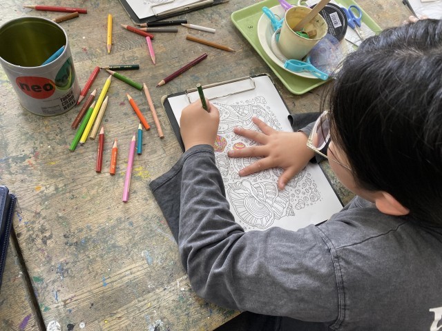 日用品を形どり、線と線の間を色鉛筆で塗っています。また細かい塗り絵にも挑戦しています。