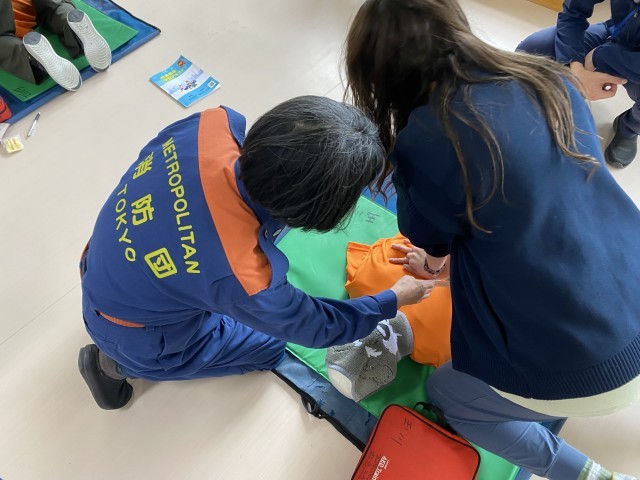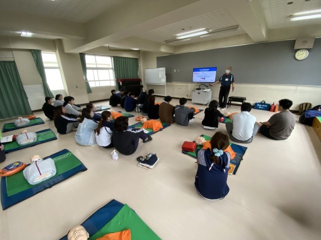 水泳の授業中などの万が一の場合に備え、胸部圧迫やAEDの使用方法を確認しています。