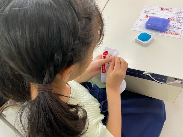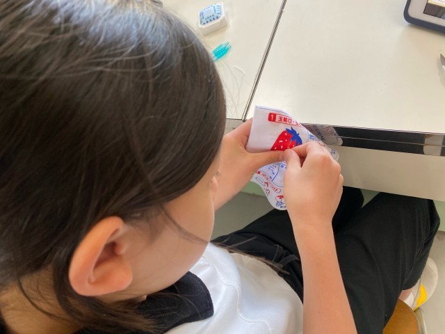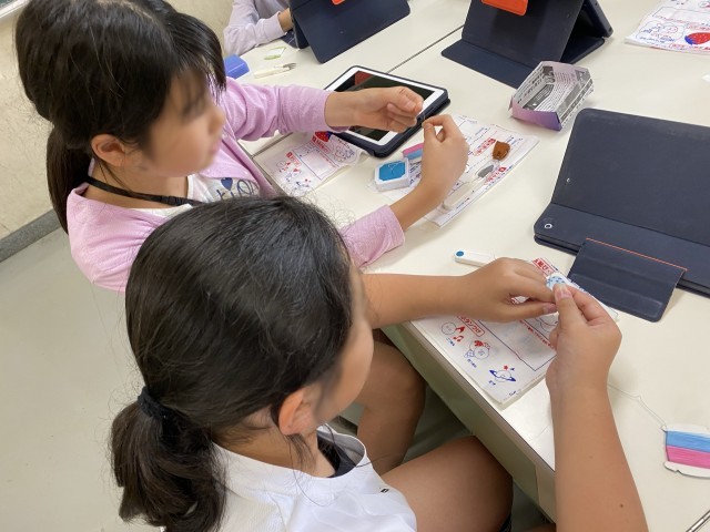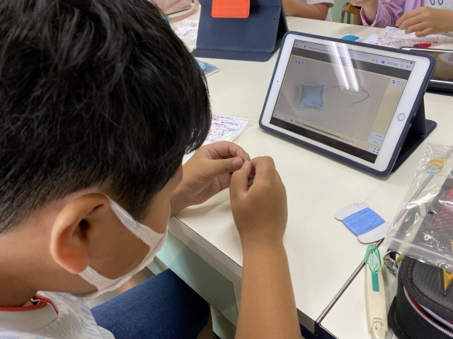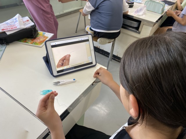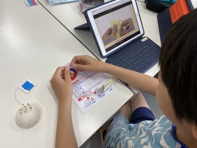 裁縫の学習が始まりました。動画を見ながら玉留めや玉結びに挑戦しています。