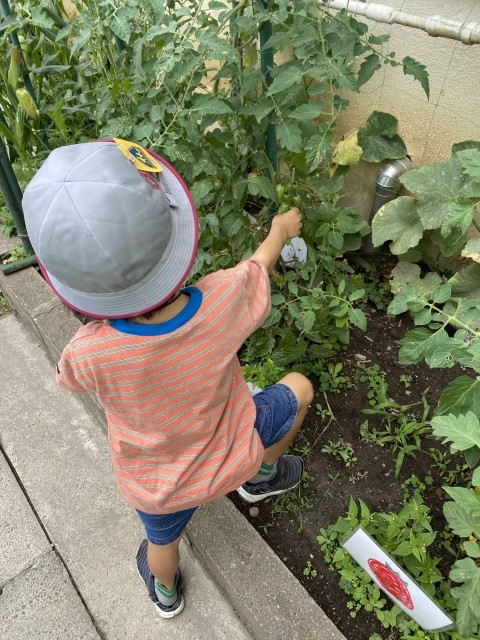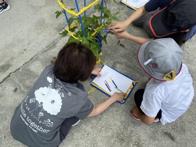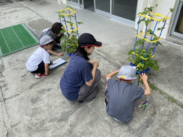 自分たちで大切に育てている朝顔の花が咲いたので、観察をしています。夏野菜も大きくなってきているので、楽しみにしています!