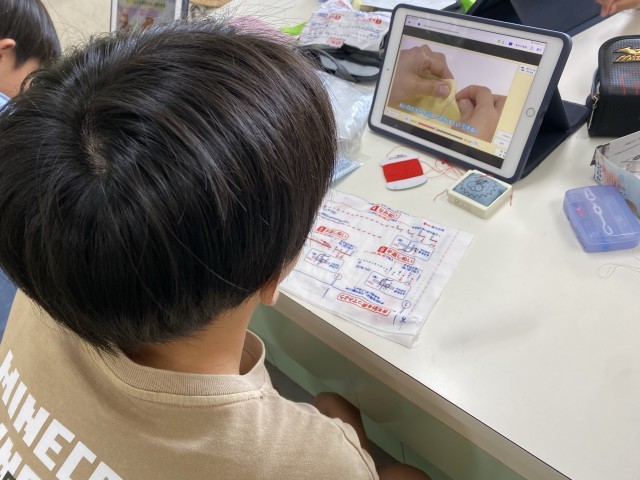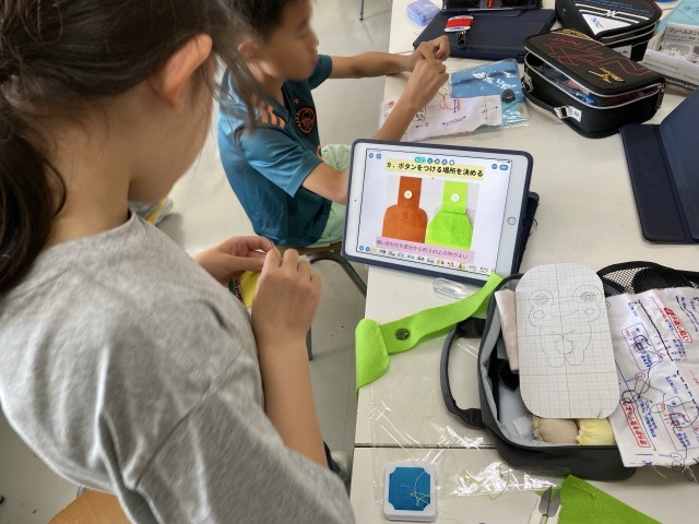 ボタンつけやなみ縫いを練習し、自分だけのネームタグを作っています。