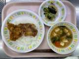 今日の給食は、タレカツ丼、大根サラダ、みそ汁(豆腐)です。 今日はけやき学級との...