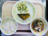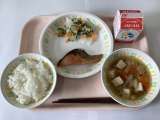今日の給食は、ごはん、牛乳、魚の塩焼き、野菜の甘酢かけ、豆腐汁です。