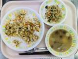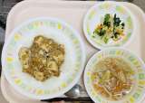 今日の給食は、 麻婆豆腐丼、牛乳、塩ナムル、スープです。