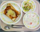 今日の給食は、 ピザトースト、クリームスープ、牛乳、ツナサラダです。