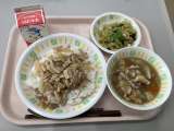 今日の給食は、豚丼、牛乳、ジャコ入り野菜のおかかあえ、具だくさんみそ汁です。