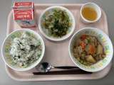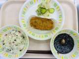 今日の給食は、子ぎつねごはん、牛乳、鯨の甘辛揚げ、野菜のゆかりかけ、豚汁です。