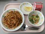 今日の給食は、スパゲッティーナポリタン、牛乳、フレンチサラダ、くだものです。