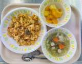 今日の給食は、 チキンライス、牛乳、ウィンナーと野菜のスープ煮、フルーツカクテル...