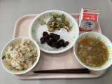 今日の給食は、 梅わかごはん、牛乳、松風焼き、大根ときゅうりの中華あえ、白玉しる...