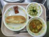 今日の給食は、国産小麦ソフトフランスパン、牛乳、カレーシチュー、野菜のゴマだれか...