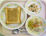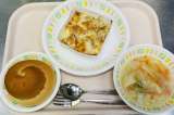 今日の給食は、ミルクパン、牛乳、豆腐のグラタン、白菜のスープです。