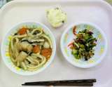 今日の給食は、すき焼きうどん、牛乳、白菜の海苔和え、さつまいも蒸しパンです。