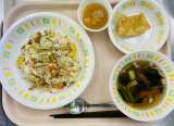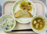 今日の給食は、わかめごはん、牛乳、ジャンボぎょうざ、春雨サラダ、ザーサイスープで...