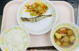 今日の給食は、ごはん、牛乳、ししゃもの磯辺揚げ、野菜のおかかかけ、筑前煮です。