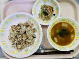 今日の給食は、ビビンバ、牛乳、塩ナムル、ピリ辛トックスープです。