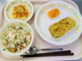 今日の給食は、炒めそば五目あんかけ、牛乳、ハム入り中華サラダ、かぼちゃのチーズケ...
