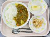 今日の給食は、チキンカレーライス、牛乳、ハムサラダ、くだものです。