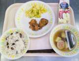 今日の給食は、赤飯、セレクトドリンク(5種類の中から1つ)、鶏肉の竜田揚げ、野菜...