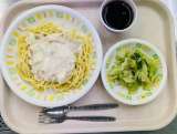 今日の給食は、カルボナーラ風スパゲッティ、牛乳、グリーンサラダ、ぶどうゼリーです...