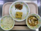 今日の給食は、ごはん、千草焼き、切り干し大根の煮つけ、とうふとわかめのみそ汁、牛...