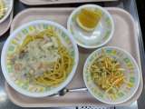 今日の給食は、スパゲッティクリームソース、パリパリサラダ、くだもの(河内晩柑)牛...