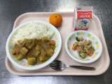 今日の給食は、カレーライス 牛乳 ひよこ豆サラダ 冷凍みかん