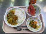 今日の給食は、夏野菜のカレーライス、シャキシャキ野菜、くだもの(小玉すいか)、セ...