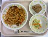 今日の給食は、 スパゲッティナポリタン、コールスローサラダ、黒砂糖蒸しパン、牛乳...