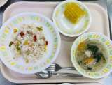 今日の給食は、 ナシゴレン、蒸しとうもろこし、野菜スープ、牛乳です。 〈今...