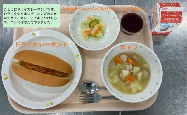 カレー粉で味つけをして、食べやすいようパンにはさんで焼きました。