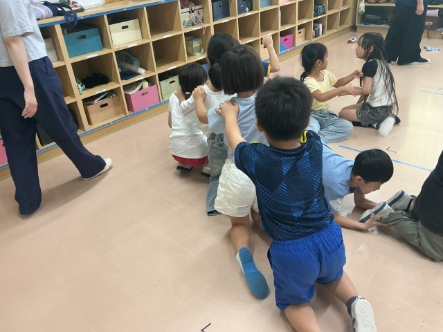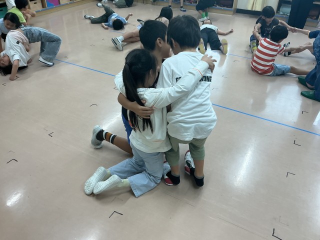 初日は、「だるまさんが転んだ」から派生したゲームを行い体を使って様々なものや生き物、人になりきりました。また、友達数人と協力した1つのものを表現する活動を行いました。初めはなかなか上手くいかず苦戦しているところもありましたが、次第に「ここはもうちょっとこうしようよ!」といった声も聞こえてくるようになりました。