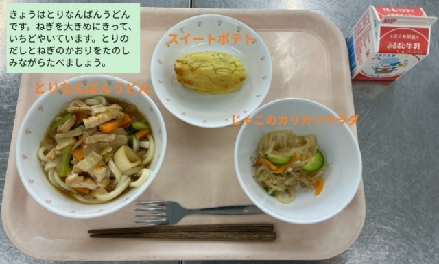 今日は鶏南蛮うどんです。ねぎをいつもより大きめに切って、一度オーブンで焼いています。